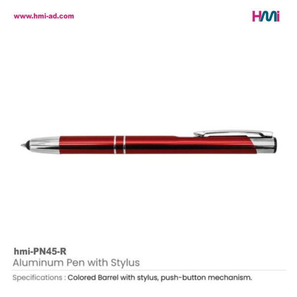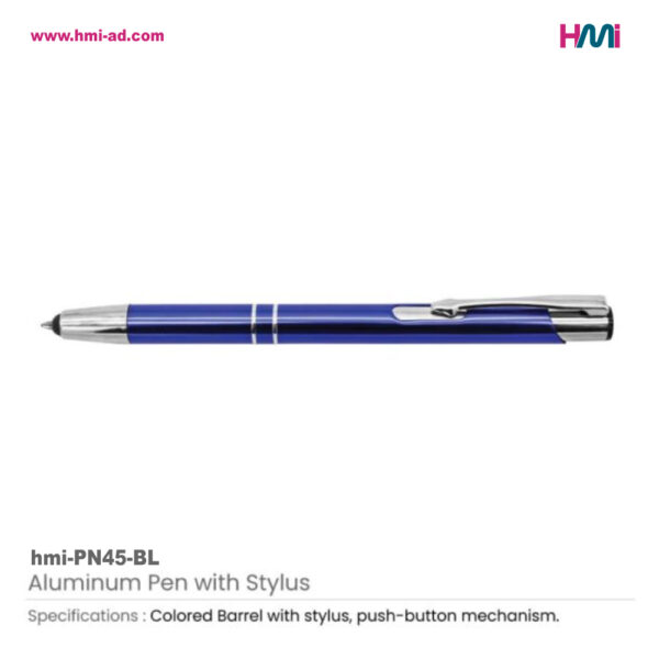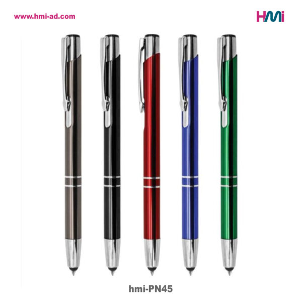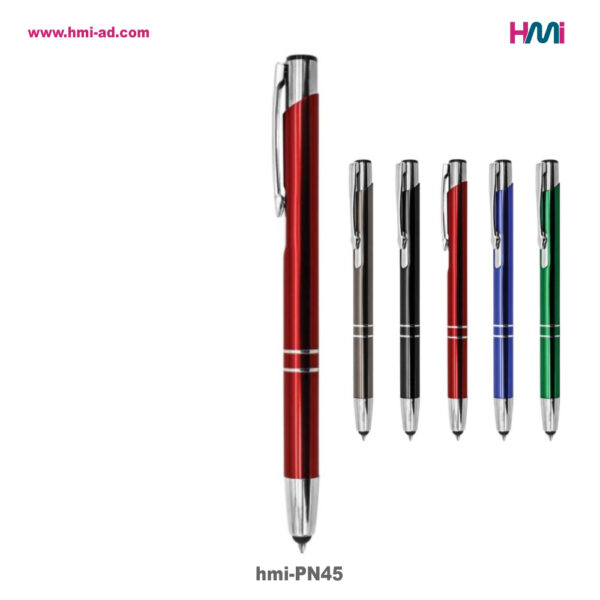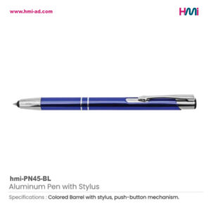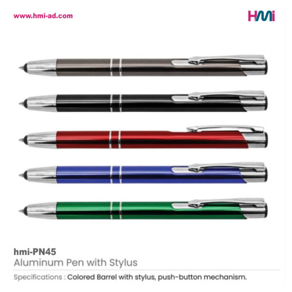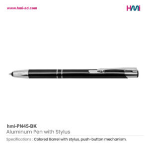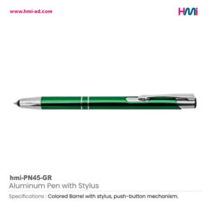 Introducing to you our stylus-equipped promotional aluminum made pens.It has been made from light weigh strong aluminum with nice shiny finishing available at to p price and large stock ready to be brand with your logo. The bright metal barrel of this multipurpose pen is its main feature which this article has. Available in five distinct color options which every colour comes with different metal barrel. Black, green, silver, blue, and red are the colours we offer for Aluminum Pen 45. The other parts of it include the barrel, clip, and silver tip which it turns this item to one of the most inquired promotional pens in Germany.