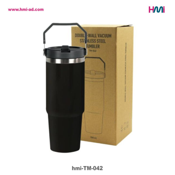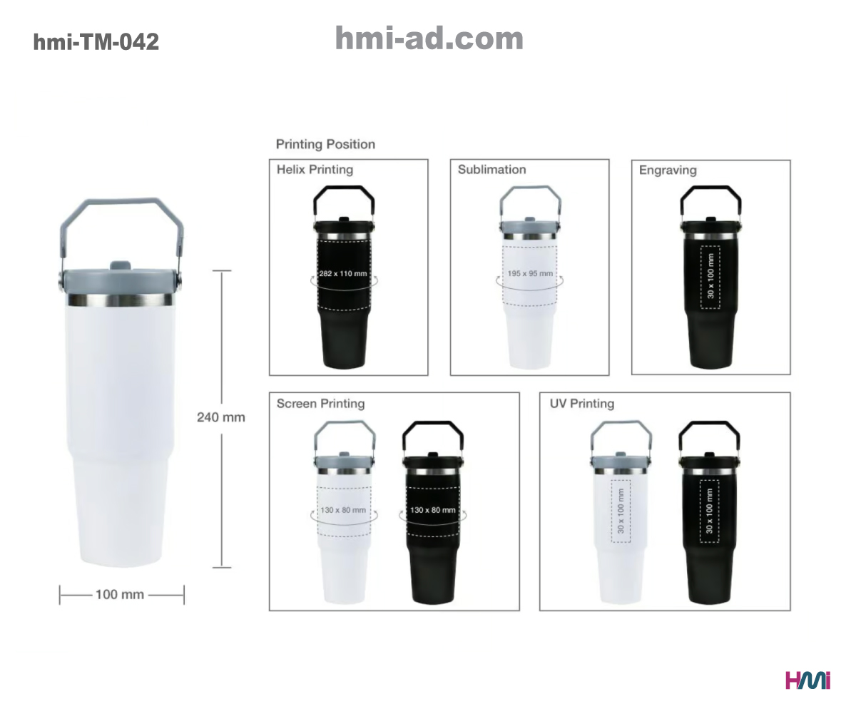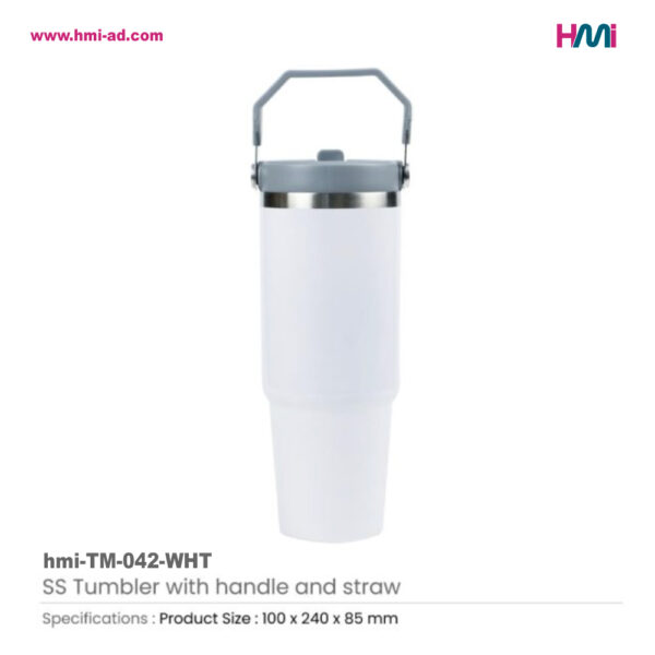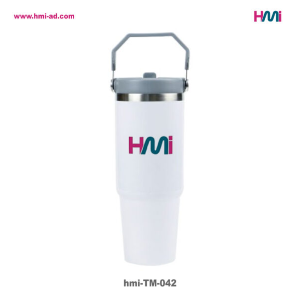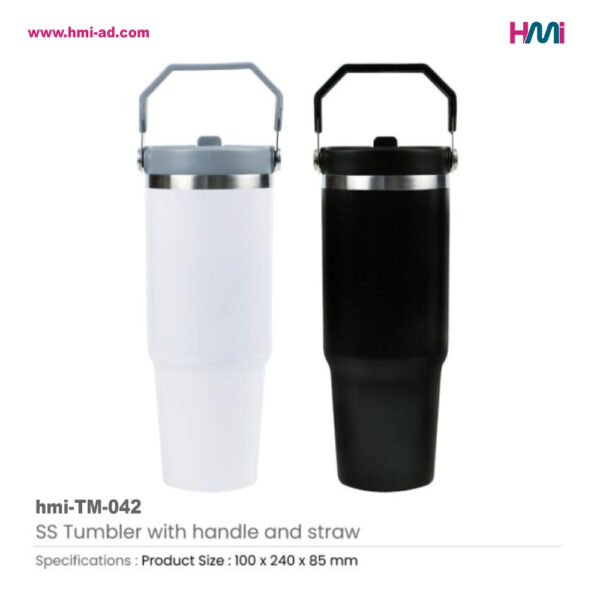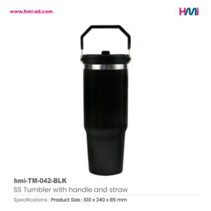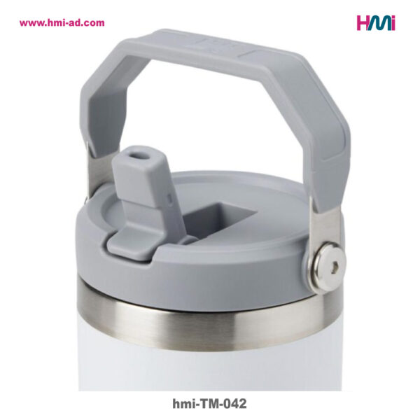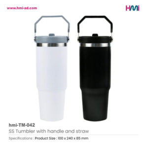 Tumbler in stainless steel double-wall vacuum insulated tumbler with flip-straw Lid and carry handle. The customized vacuum-insulated tumbler is ideal for keeping your beverage hot for hours. These tumblers are durable as they are made with premium quality, stainless steel material. They also come with a double wall design to maintain the freshness and taste of your drink.