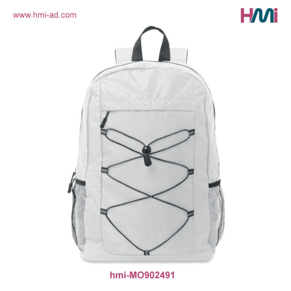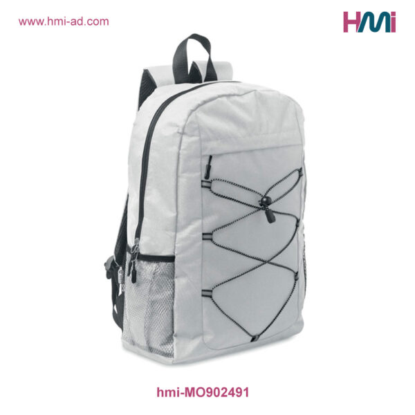 Polyester Backpack with logo printed in Germany. Promotional back pack made from high quality Polyester, available in different colours for branding. Our promotional Polyester Backpacks are made from RPET materials using Polyester with zippered pocket on the from and 2 pockets on the sides. They are great by their material, and price affordable promotional product.
