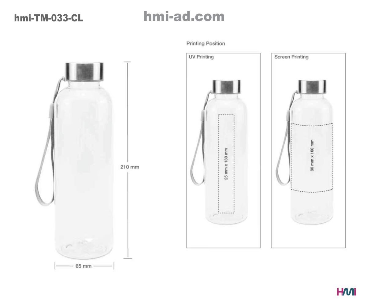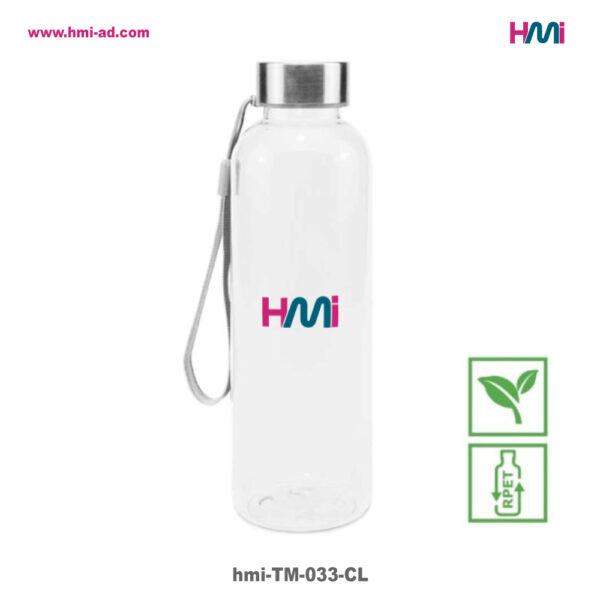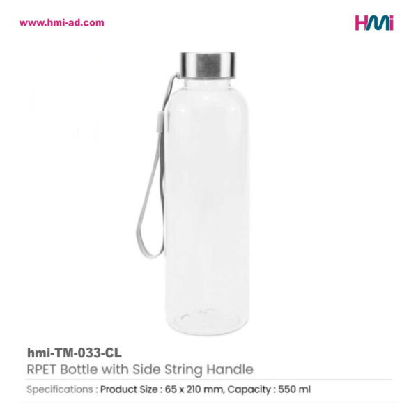 A great promotional drink ware which is made from Transparent 550 ml RPET Bottles with an SS Lid and Side String Handle.